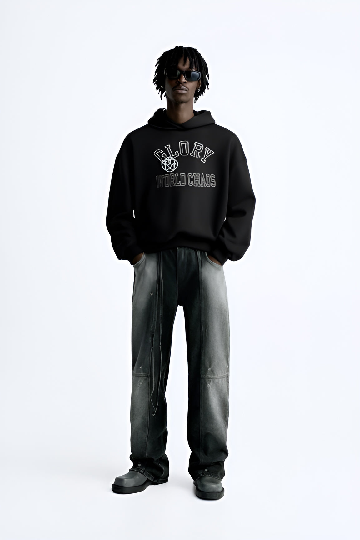The design stands out with a heat-applied image on the front, a bold graphic element that evokes a futuristic and avant-garde aesthetic. The silver streaks on the sleeves add an extra touch of dynamism and refinement. Entirely made in Italy, this hoodie represents the pinnacle of Italian craftsmanship, perfect for those seeking an exclusive garment with a distinctive character.